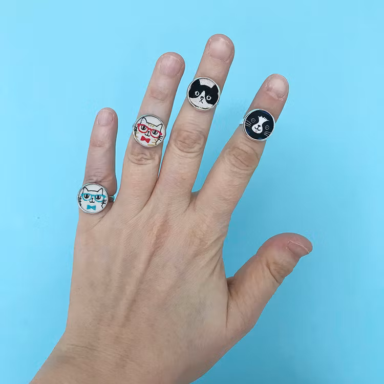 Storlek på motivet 1.4 cm. Storlek på ringdelen ca 1.6 cm. Ställbara, passar barnfingrar och lillfingret på många vuxna. Silverpläterade, nickelfritt.