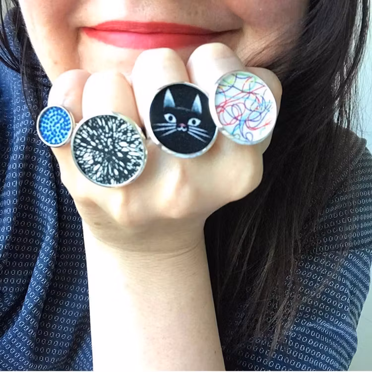 Lilla ringen: Storlek på motivet 1.4 cm. Storlek på ringdelen ca 1.6 cm. Ställbara, passar barnfingrar och lillfingret på många vuxna. Silverpläterade, nickelfritt.